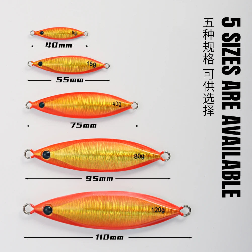 Available in 5g, 15g, 40g, 80g, and 120g, it’s tuned for versatility — from light coastal drifts to deep vertical slow-pitch presentations. Each jig cuts cleanly through the water, holding balance on the fall and delivering that irresistible side-to-side sway that defines slow jigging perfection.