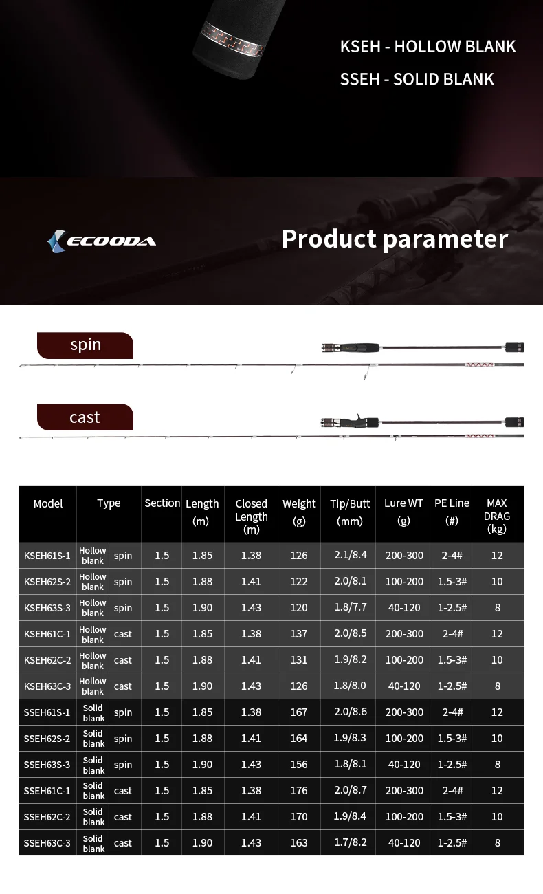 Crafted with two unique builds, the KSEH (Hollow) and SSEH (Solid) versions let you choose your weapon. The KSEH hollow blank uses a dual-layer carbon design — a 30T core with a 40T outer wrap — delivering a feather-light feel with extreme responsiveness. Every pulse, tap, or bottom touch is transmitted directly to your hand, giving you absolute control over your jig’s rhythm and action. The SSEH solid blank, made from full 30T carbon fiber, offers a denser structure with immense lifting power and shock resistance, built for deep water and large, hard-fighting fish.