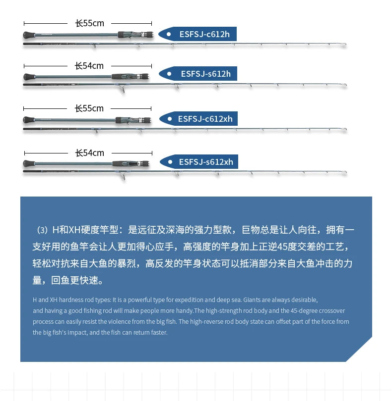 Featuring high-quality FUJI SIC or Alconite guides and available in both spinning and casting models, the ESFSJ series offers maximum line protection, smooth casting, and superior corrosion resistance. Its deep parabolic bend enhances jig movement and increases hook-up rates with slow pitch techniques.