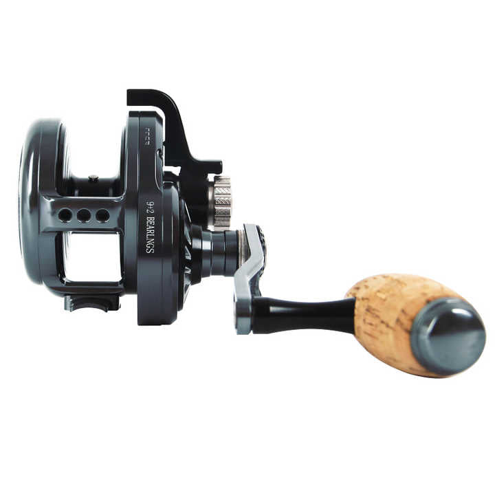 Features interchangeable T-Type Cork and EVA handle grips for ergonomic power cranking in all-day jigging sessions.