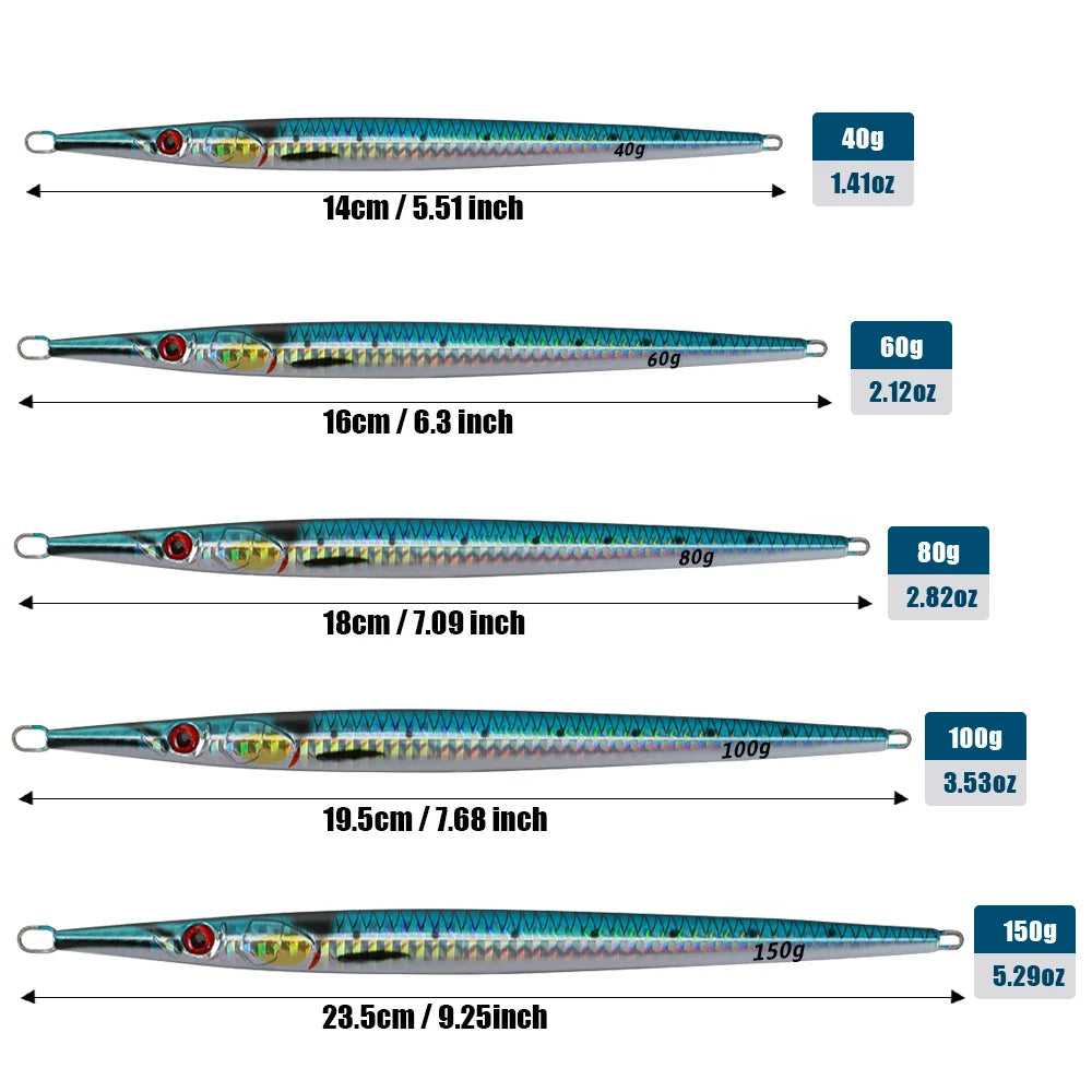 Four Dialed‑In Weights – 40 g, 60 g, 80 g, 100 g cover mid‑water bait balls to deep reefs.