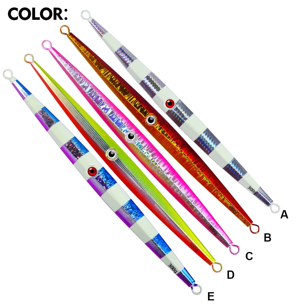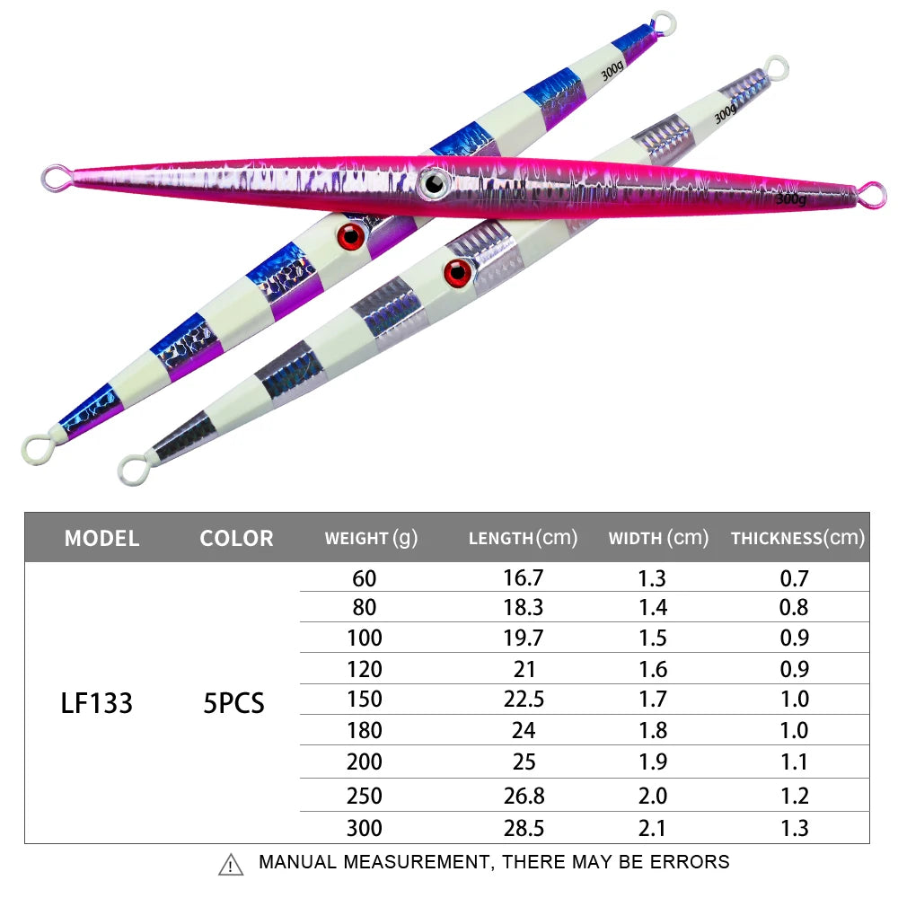 Includes 5 jigs: 60g, 100g, 150g, 200g, and 300g